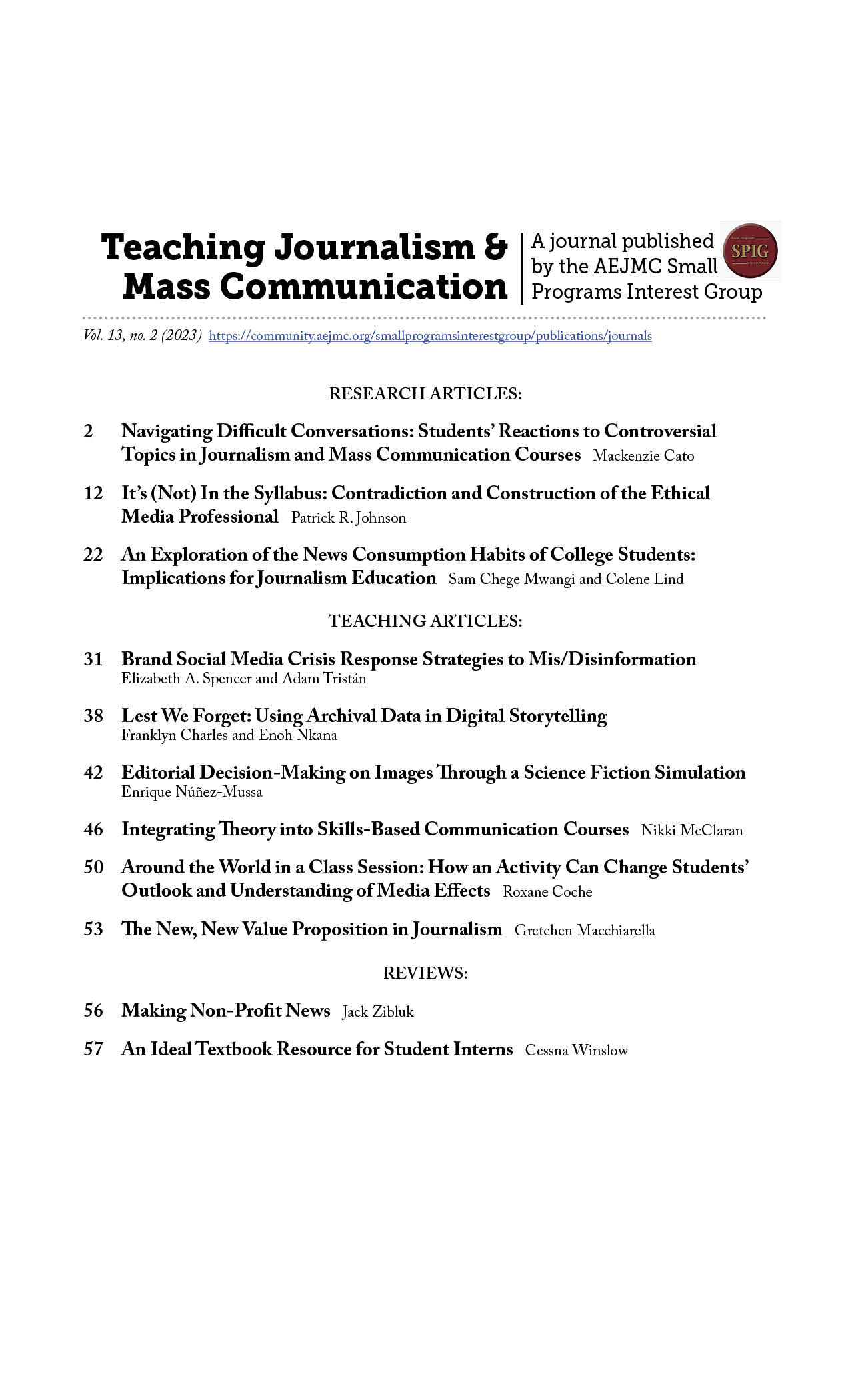This issue of Teaching Journalism and Mass Communication is rich with analytical research and innovative classroom practices. In the research section, Mackenzie Cato explores the increasingly fraught ground of addressing controversial topics in classrooms, and suggests some best practices; Samuel Mwangi and Colene Lind consider if there is a gap between the news consumption habits of our college students and what we teach, and the implications for journalism education; and Patrick R. Johnson provides an analysis of syllabi from ethics classes that may lead some journalism and mass communication educators to reconsider how they construct this vital, and usually required, contract between educator and student.